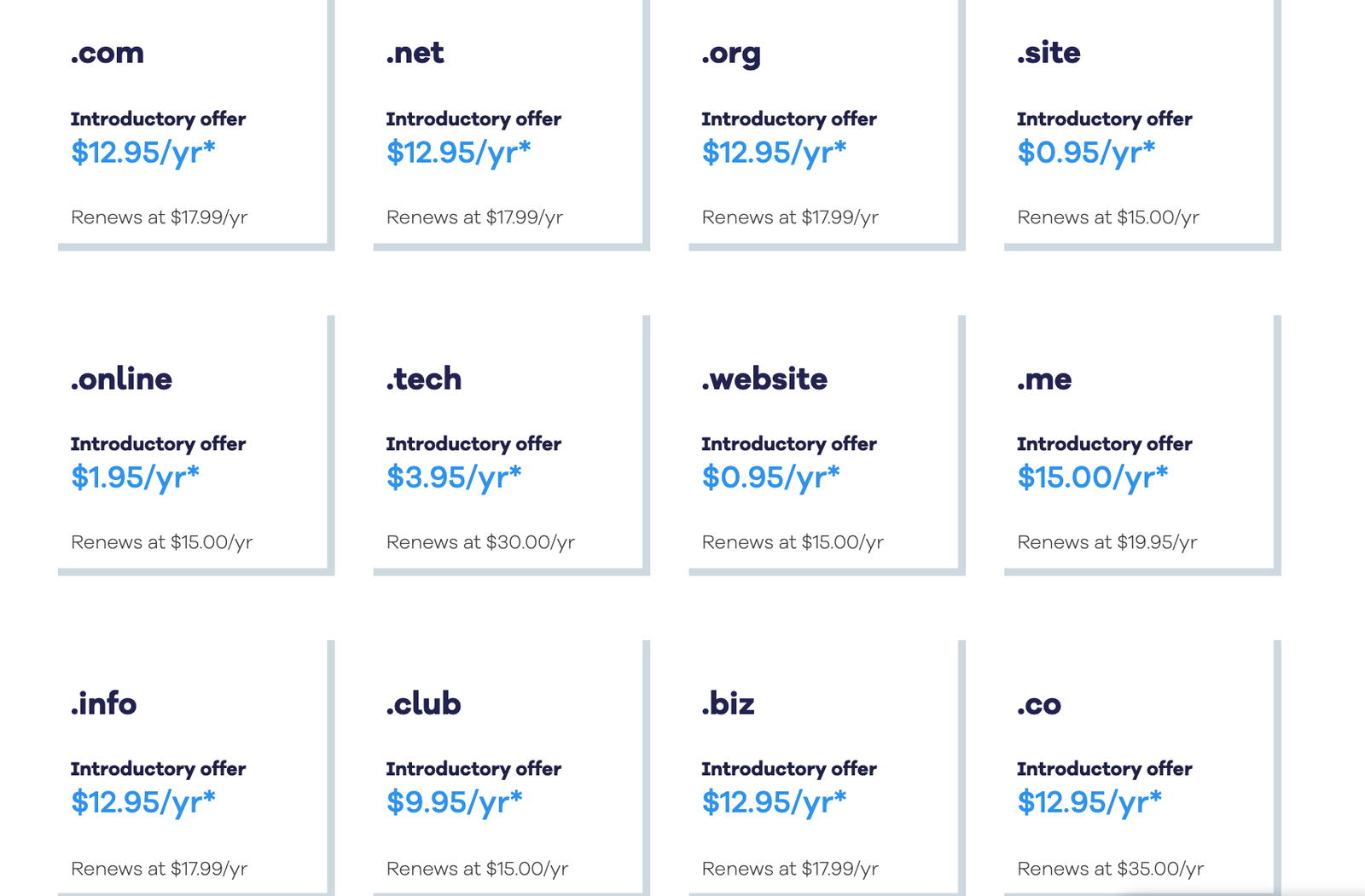Here are some of the avilable domain TLDs and their base prices on Bluehost: