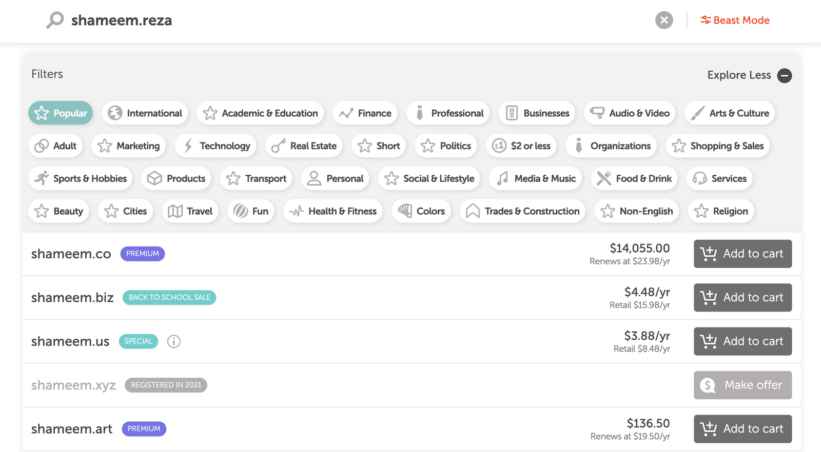 You can filter your domain search based on options like price range, suffix, keywords, etc. You can narrow your search by mentioning your niche, including travel, education, travel and lifestyle, etc.