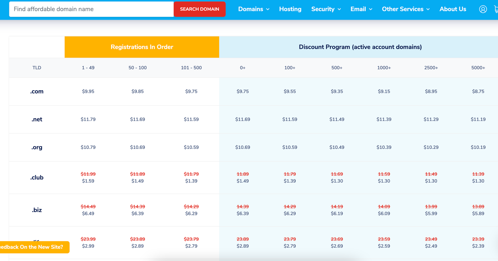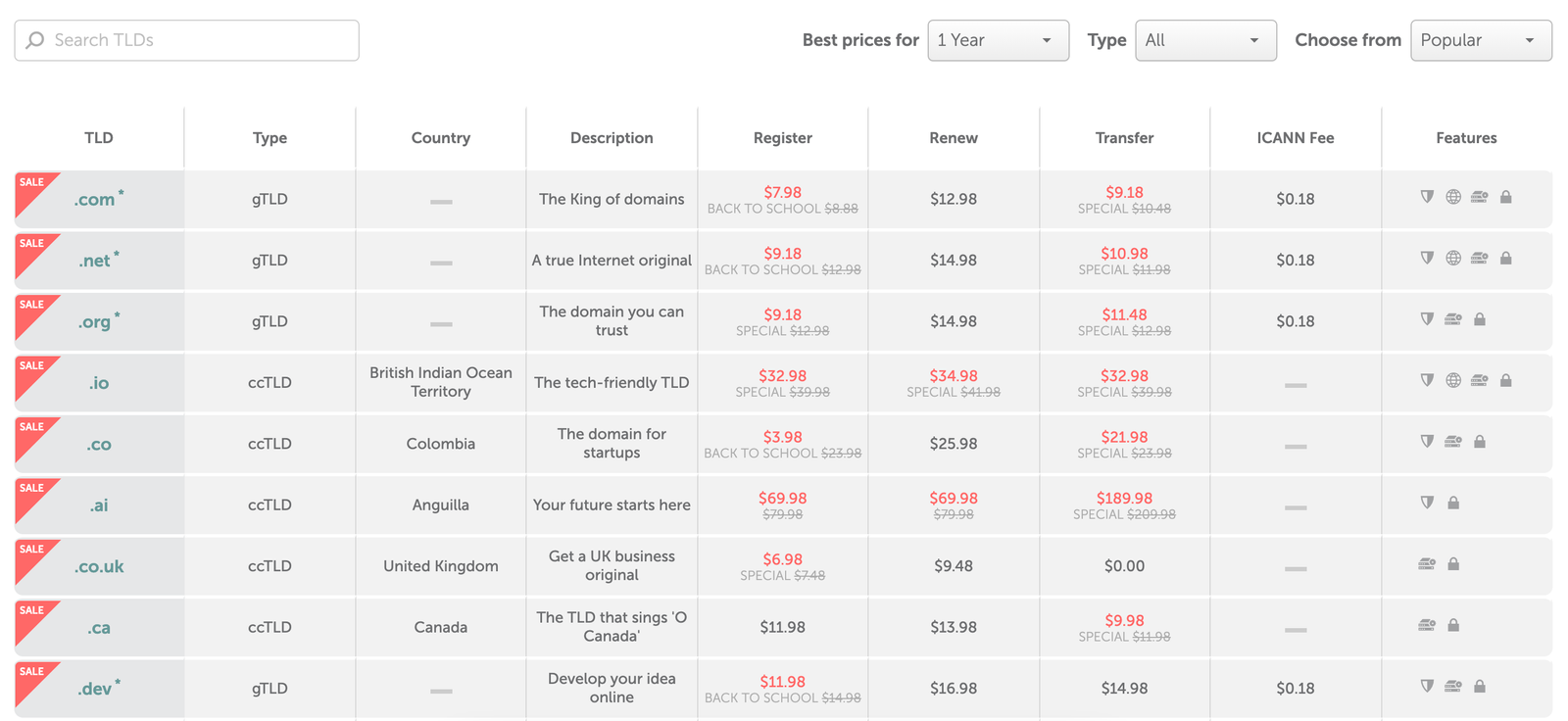 Here is a list of the first year registration prices for some domains: