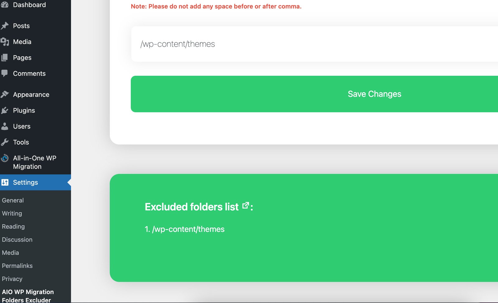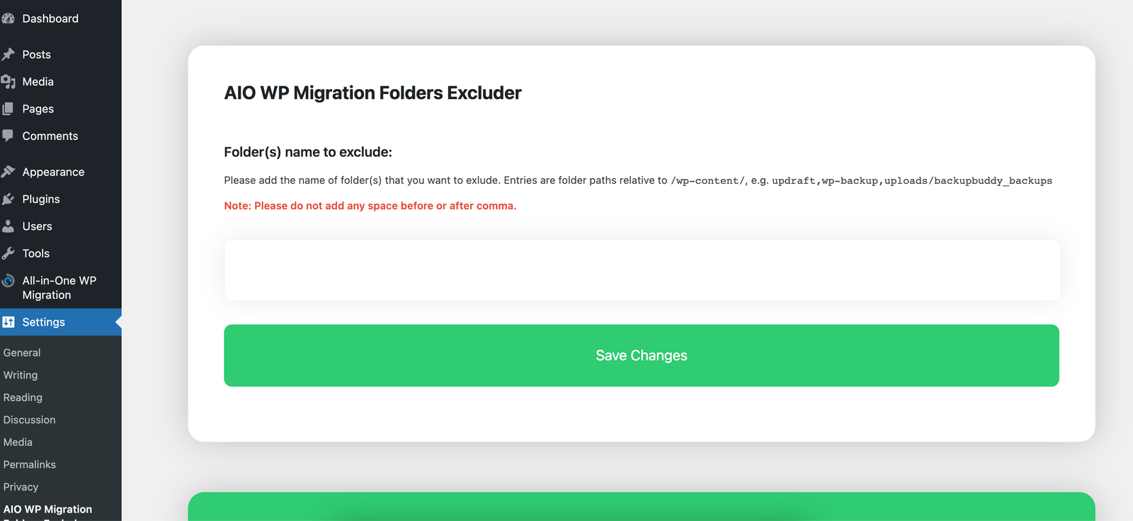 Upon opening AIO WP Migration Folder Excluder options, you will see all the configurations available, which is quite simple. You have to add the relative path of the folders under wp-content that you want to exclude; you can separate the paths with a comma.