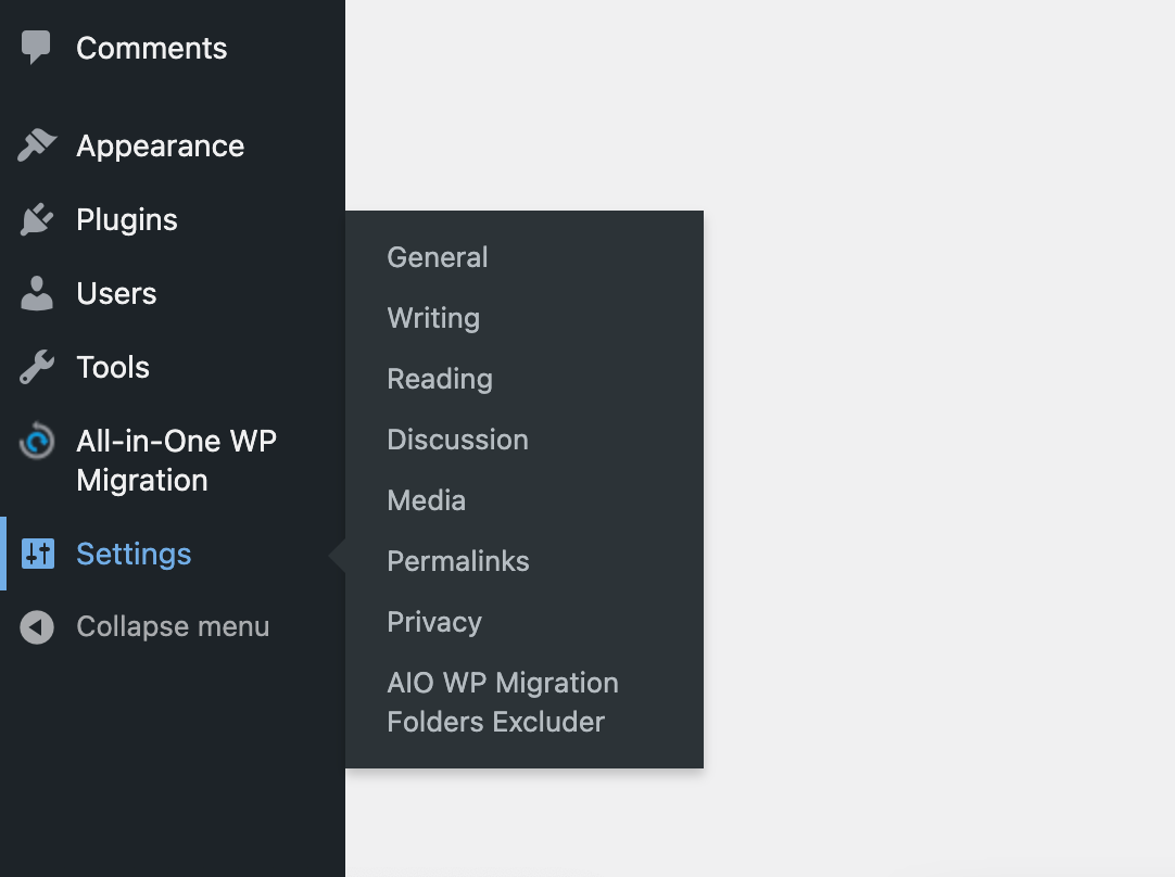 After installing and activating this Plugin, we can locate the configuration screen in the WordPress administration menu, in Settings>AIO WP Migration Folder Excluder.