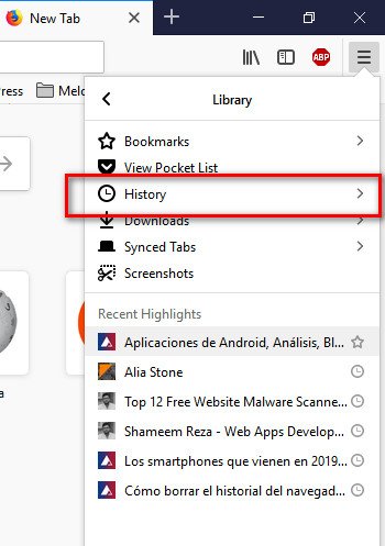 Once the menu open, click on the Library option and you will History option as per bellow screenshot. Click on it to open Firefox History clear option.