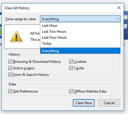 Now let be familiar with some history clean options of Firefox. You only can delete certain things from Firefox history clean option, such as cache or browsing history, or clear everything.