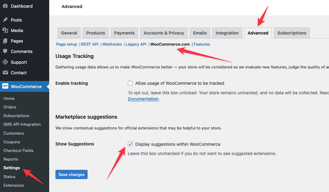 - Uncheck the box before “Display suggestions within WooCommerce.”