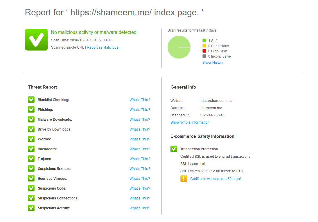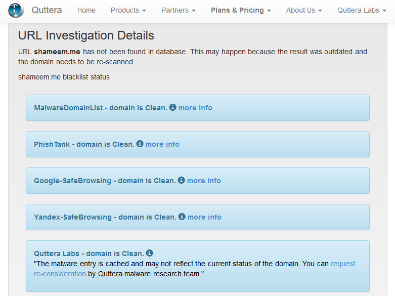 Web Inspector also offers a free scan tool to quickly check if the web page is malicious or not and will show you details threat report on following points: