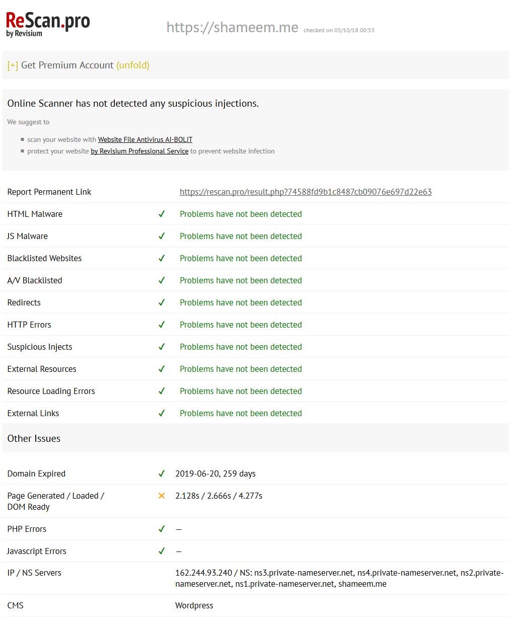 Rescan is a free website malware scanner tool that will check websites for security issues in less than 60 seconds. It provides a quick report after following checks: