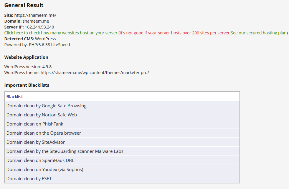 SUCURI is one of the best and most popular Security Scanners available for any platform websites including WordPress, Joomla, Magento, etc. Using Sucr’s free tool, you can scan your website for following results:
