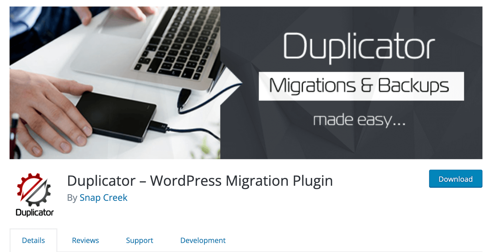 Duplicator is a benchmark plugin for migrating a WordPress site, with over a million downloads and an average rating of 5 stars.