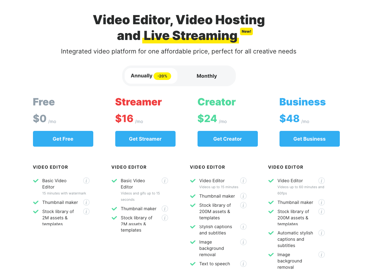 Streamer Plan: The Streamer Plan costs $16 per month and includes additional features such as the ability to upload and use your own videos and images, access to the entire library of stock videos and photos, and more advanced analytics.